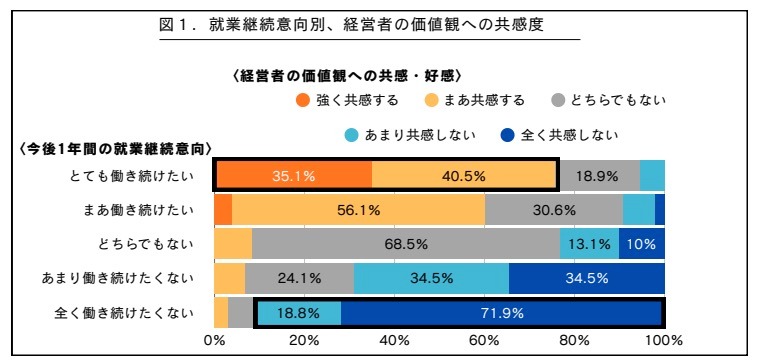 なお、同調査で「この会社で長く働き続けたくない」と回答した人の90%以上は、経営者への共感や好感を抱いていませんでした。